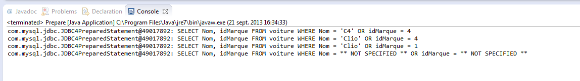 PreparedStatement stm = conn.prepareStatement("SELECT * FROM Classe WHERE Nom = ? AND Prenom = ?")