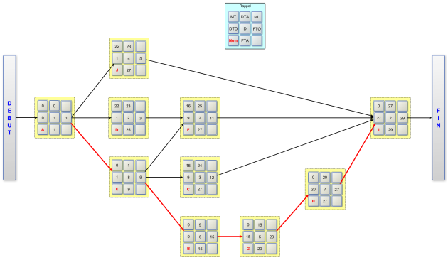 Dans notre réseau la MT la plus faible calculée est nulle le chemin critique sera donc : A,E,B,G,H et I.