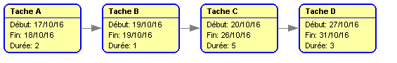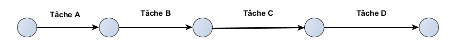 Voici l'exemple d'un réseau PERT. Il est composé de 4 tâches. Dans ce cas simple de tâches en série, 5 étapes ont été nécessaires pour le définir.