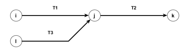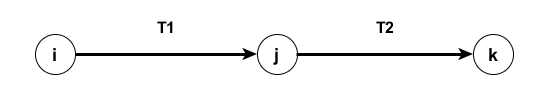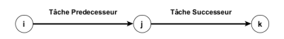 Soit deux tâches T1 et T2 avec les caractéristiques particulières suivantes : T1 est la tâche qui fait passer le projet de l'état i à l'état j, T2 la tâche qui fait passer le projet de l'état j à l'état k. On peut les représenter comme suit :