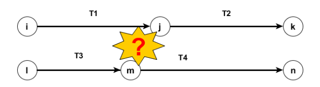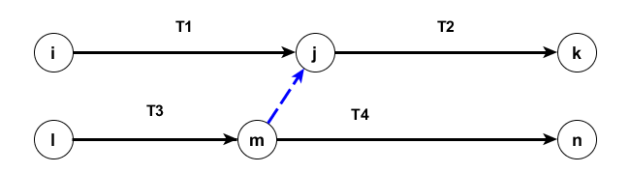 Il résulte de la règle de dépendance vue précédemment que T2 ne peut commencer que si la tâche fictive (m,j) est entièrement terminée. Or la fictive (m,j) ne peut elle-même déjà commencer que si T3 est entièrement terminée. Par transition, T2 ne peut commencer que si T3 est entièrement terminée, ce qui constitue la logique d'enchaînement du départ que nous devions préserver lors de la mise à jour du graphe PERT.