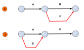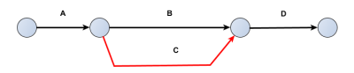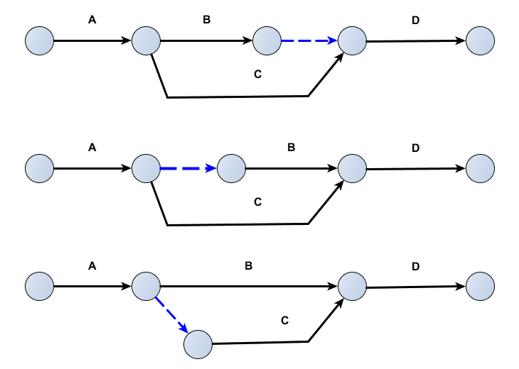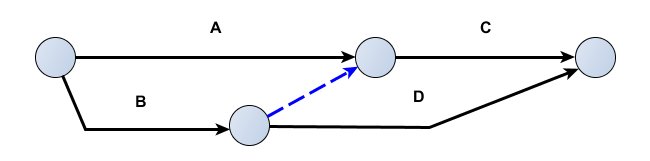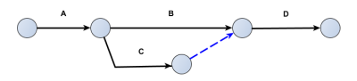 Comme cette tâche fictive ne sert qu'à rajouter une étape intermédiaire pour que les tâches B et C n'aient plus les mêmes identifiants, il s'avère qu'elle peut indifféremment, pour ce cas précis, être placée à l'un des 4 emplacements suivants : au début de B, à la fin de B, au début de C ou à la fin de C.