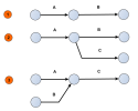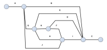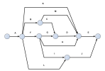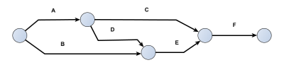 Si l'on n'est pas gêné de faire figurer une contrainte redondante ("C dépend de A" via les 3 fictives en série alors que C dépend déjà de A via B), on peut encore simplifier avec le diagramme PERT ci-dessous, lequel répond complètement aux contraintes exprimées entre les tâches :