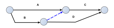 A cause de la contrainte sur l'absence de tâches en double (deux tâches ne peuvent pas être identifiées par le même couple d'étapes début et fin), la construction de ce graphe PERT nécessite l'utilisation d'une tâche fictive.