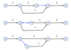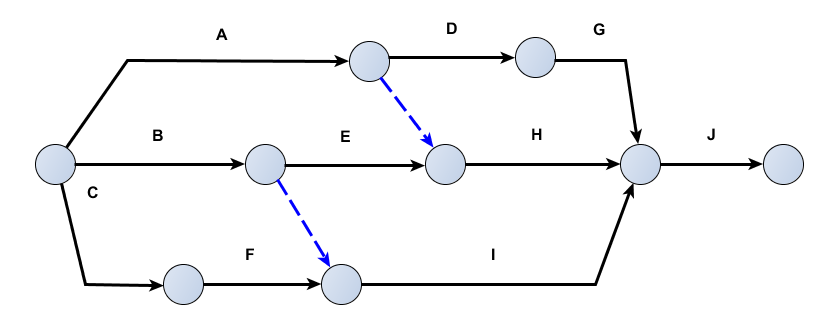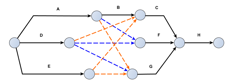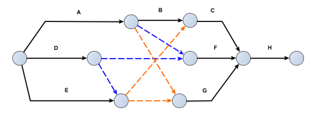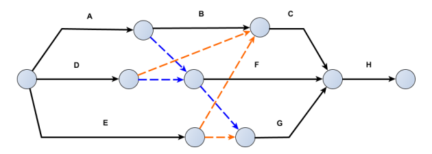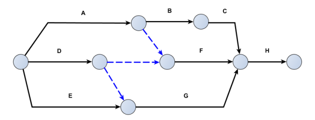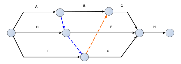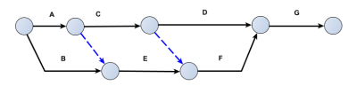 La contrainte de la fin de D sur le début de C est alors transmise via les deux fictives en série et G dépend bien de A, D et E. Même si ce graphe permet l'économie d'une tâche fictive, il risque d'être moins explicite au sujet de la relation d'antécédence existant entre D et C.