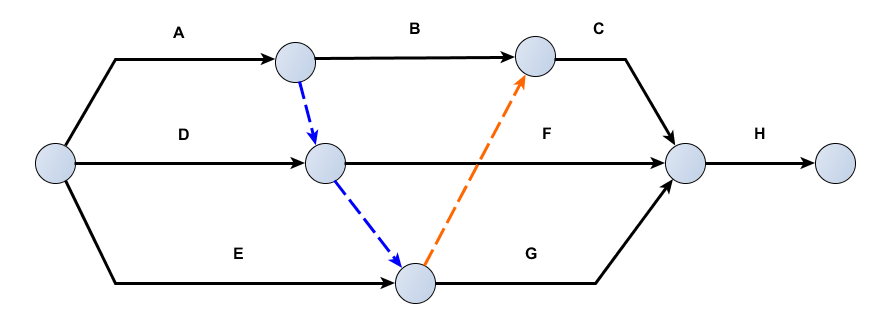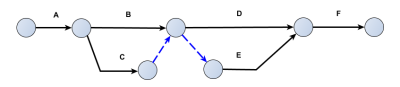 Pour que C dépende de E, c'est différent tant que la même étape sert de fin à E et de début à G tout en supportant la contrainte "après la fin de D" apportée par une tâche fictive placée entre D et G. Il faut donc dédoubler la fin de E et le début de G en les maintenant liées au moyen d'une nouvelle tâche fictive. Puis une tâche fictive supplémentaire entre la fin de E et le début de C répondra au besoin.