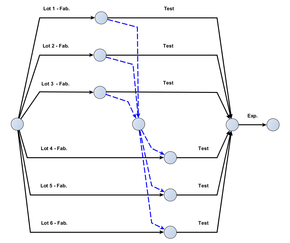 " ... sur ce point, notre contrat prévoit la fourniture de 6 lots d'équipements standard ... bon, je simplifie pour que vous compreniez mieux : la production de chaque lot consiste en une première opération de fabrication suivie d'un test d'endurance ... ah oui, les fabrications des 6 lots ont déjà toutes commencé, on vous a pas attendu ... on pourra expédier dès que le dernier test sera terminé vu que tout part dans le même container ... pour des raisons techniques, les tests des lots 4 à 6 nécessitent chacun qu'on ait fabriqué les trois premiers lots ... "