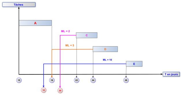 La marge libre de la tâche A est la plus petite de ces marges et est égale à 2 cela correspond au retard que peut prendre A sans décaler le début au plus tôt de C.