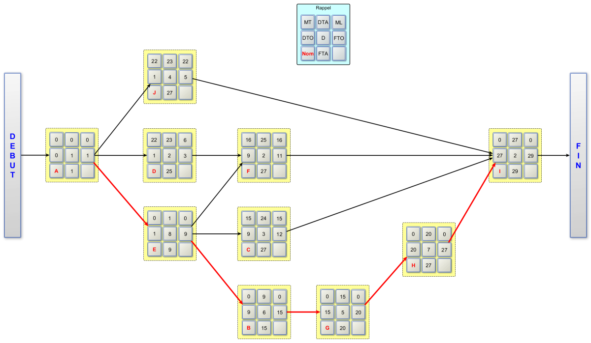 Ainsi par exemple pour D : le début au plus tôt de la tâche suivante F est 9 et la fin au plus tôt de la tâche D est 3 on trouve donc ML (D) =9 -3 = 6.