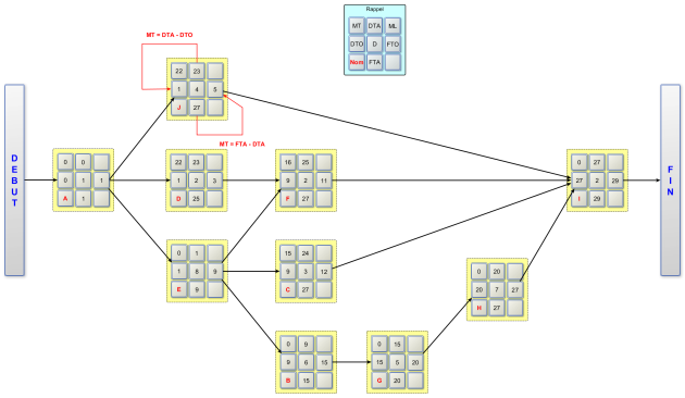 Au début du projet on ne peut pas trouver de marge négative (la date est toujours plus grande que la date au plus tôt) mais il peut arriver au cours du déroulement du projet des retards qui peuvent amener à calculer une date de fin au plus tôt supérieure à la date de fin au plus tard calculée au début du projet.